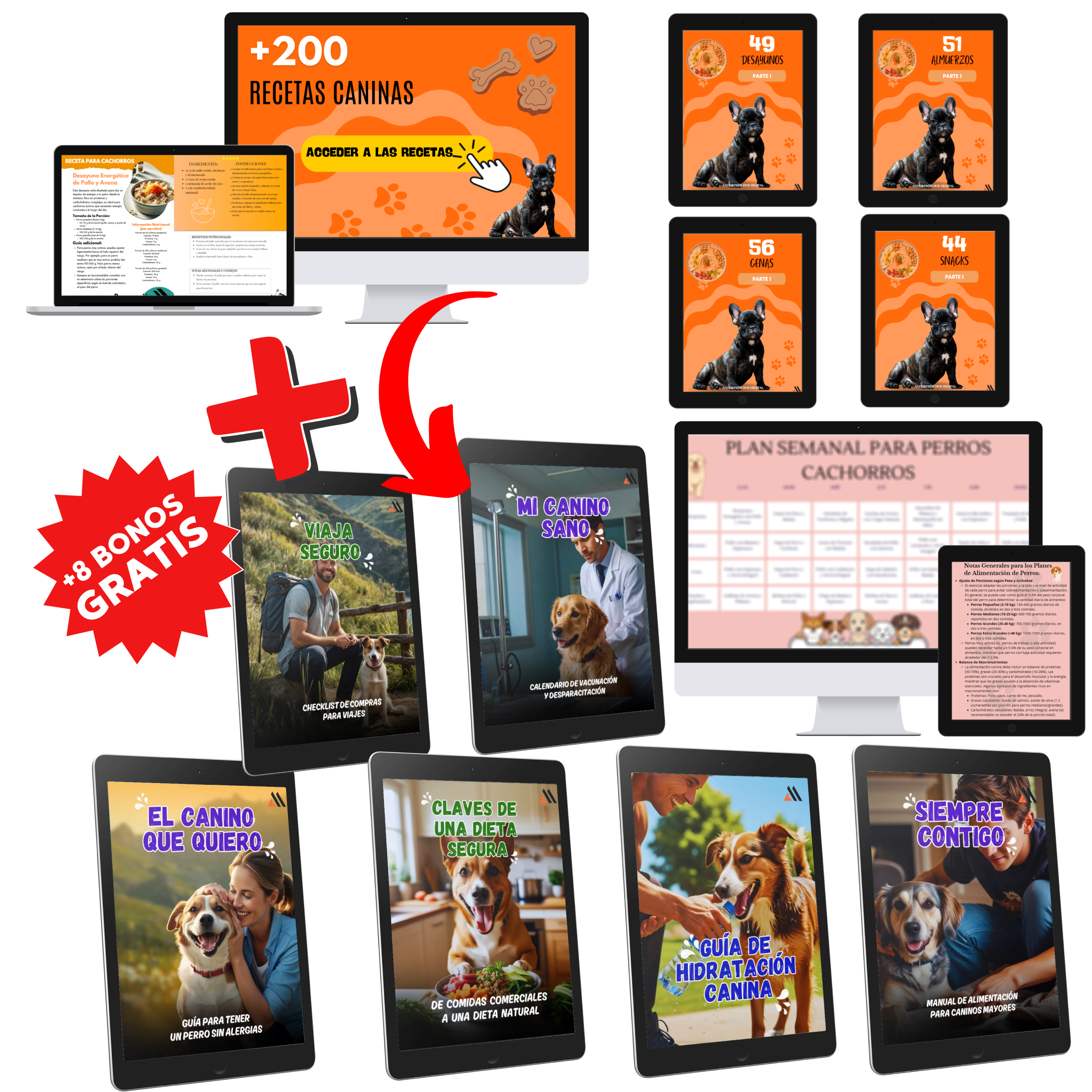 Es un libro completo con 49 desayunos, 51 almuerzos, 44 snacks y 56 cenas, organizado en más de 560 páginas llenas de ideas prácticas. Una ruta clara y cercana para transformar su nutrición en cada etada de vida: cachorros, adultos y senior, desde perros pequeños hasta grandes.