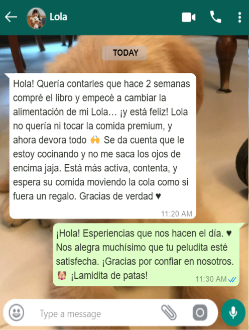Si pasado 7 días nuestro programa 200 Recetas naturales para un perro sano y lleno de energía no cumple o supera tus expectativas, puedes solicitar el reembolso total de tu dinero y lo haremos sin hacer ninguna pregunta, formularios, NADA.